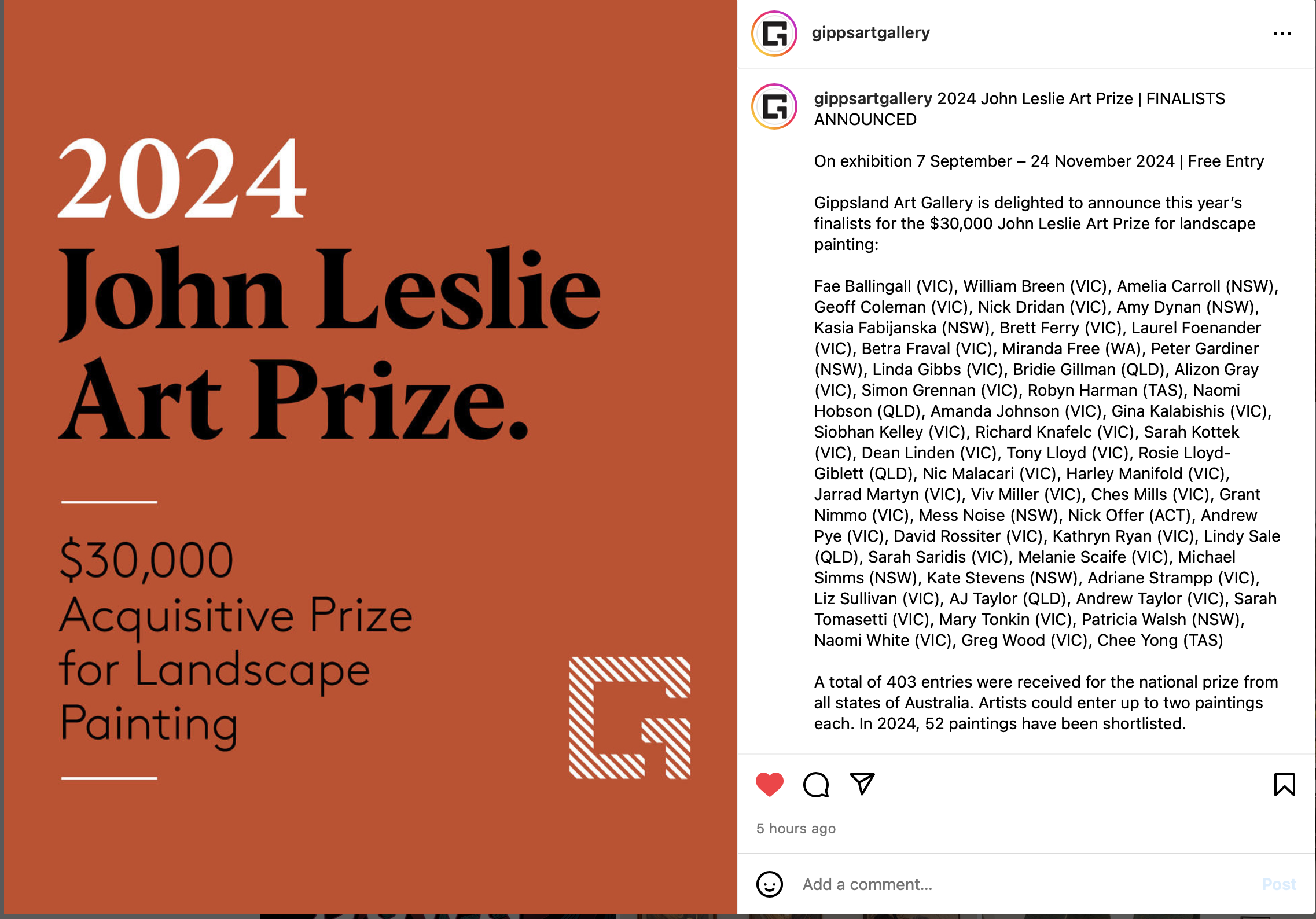 Very honoured to be only WA artist selected as a finalist in this Art Prize which was announced 5 August 2024. Hoping that I would be supported to attend the opening and winner announcement at Gippsland Art Gallery in
